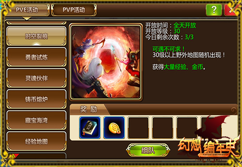 【时空裂痕】每日15次,可以获得经验、金币和随机宝箱。