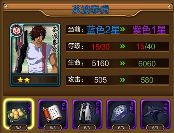 绿色2星升蓝色1星:兵粮丸X3+卷轴X3+死神服X3+海楼石X3+手里剑X3+英灵