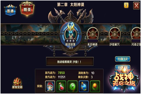 《战神天启之旅》的“副本”在游戏界面的右上角,玩家点击一下即可进入副本主界面,这么面蕴含了游戏所有的关卡副本,玩家每次把大关卡的终极BOSS打败之后,新的关卡就会随之解锁,随着解锁的关卡越来越多,副本的难度和奖励也会随之提升。