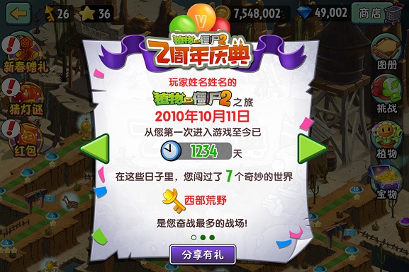 打开《植物大战僵尸2》两周年特别版游戏,一封记载着玩家专属游戏旅程的感谢信让小编眼前一亮:闯过了多少个奇妙世界,在哪个世界里挥洒过最多的心血,击杀过多少种邪恶僵尸……这些玩家与游戏的欢乐记忆都通过一封感谢信为粉丝们记录。PopCap的用心让小编还有几分感动呢。此外,分享这份感谢信到微信朋友圈,还可以获得钻石金币礼包并参与公仔等礼品抽奖呢。