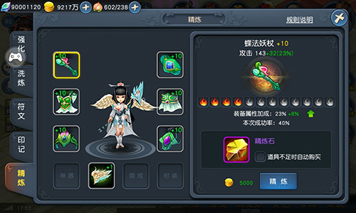 人在江湖飘,哪能不挨刀,要想挨的少,就要刀够快!64级以上的道友快来体验:全新“精炼”系统为你锻造无敌利器,免遭各种碾压。精炼所需材料为精炼石以及黄金,20块灵石可以购买1块精炼石,随着精炼等级的提升,耗费黄金也会有所浮动。“精炼”可将普通装备最高精炼到12级,不过不一定每次精炼都成功,成功时装备升一级,失败时减一级(心疼)。小编实践:对蝶法妖杖进行了10次精炼,7次成功!道友们请放心使用!