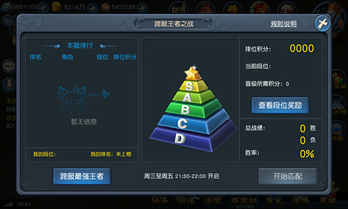 想要挑战群豪征服天下么?“王者之战”为你提供找茬的借口!每周三到周五21:30-22:00面向所有玩家开启跨服排位赛,存在最强王者、S、A、B、C、D六个段位。