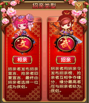 玩家在到达一定的等级后就会开启家园玩法,与其他游戏不一样,《擂台抢亲》中要组建家庭,另一半都是要“抢”回来的。当家园玩法开启后,玩家可以在“月老庙”里面,通过招亲、相亲和抢亲的方式获得另一半。目前游戏已开放招亲和相亲的玩法提供给玩家。