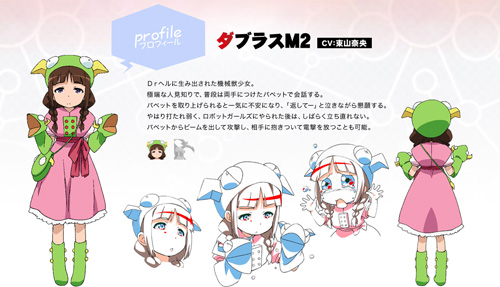 作为反派杂鱼2号,达普拉斯妹妹本不该如此耀眼,可能是动画制作人对幼女的过度偏爱,导致将原本丑的不行的达普拉斯M2机甲娘化为如此可爱的幼女,动画里的戏份也是直逼3主角,在游戏中也是一个非常重要的BOSS,各种卖萌,CV还是东山奈央哦!设定上非常的怕生,使用两只龙形手套来代替自己说话(其实是腹语),一旦手套被抢走,哭给你看哦!