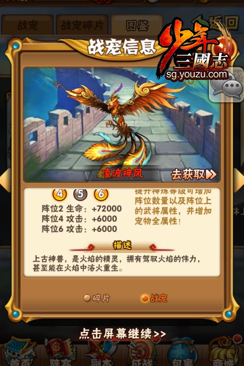 卧龙凤雏得一可安天下,在三国中如是说,在少年三国志中,两只并驾齐驱的战宠亦是顶级红色品质,出征的不二之选。很多少年已经将魔龙收入囊中,那么这只很早就在图鉴中跟大家见面的凤凰,如今也将降世三国!此次更新也调整了战宠的技能,让其更具战斗价值,而图鉴中的属性也即将激活,真是横空出世无人能挡!
