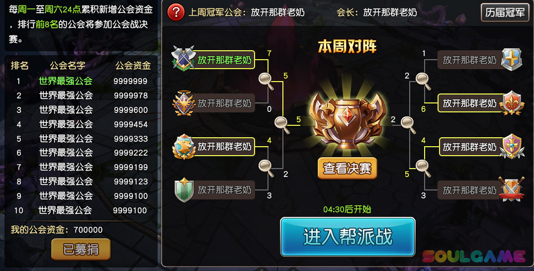 公会的玩家每天都可以进行一次募捐,根据募捐钻石数量将获得相应的公会资金。每周一至周六期间累计新增公会资金前八名的公会获得本周公会战入围资格。不积跬步无以至千里,要想在每周结算的时候挤进资金前八离不开公会里每一位成员的共同积累。团结是立会之本,相信伴随着公会战的开启,会让游戏公会更具凝聚力。
