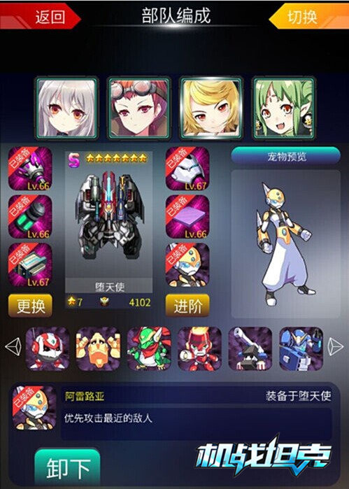 为激发堕天使最大效能,推荐大家配件可以使用大型攻击核心、超级炮弹、脉冲发射器、纳米护盾等能够使堕天使发挥最佳水平;宠物则建议选择阿里路亚和基连,都是可以优先攻击对手掌握先手优势将会对战局结果产生影响哦!~
