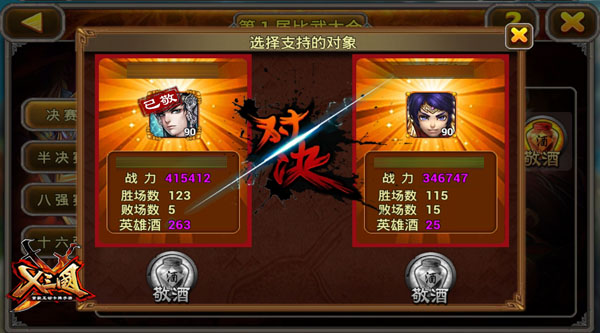 大神激战正酣,其他主公的围观热情也日趋高涨!晋级失败但又不想错过对抗肿么办?如何为战场上的基友加油呐喊呢?《X三国》特制“英雄酒”满足主公们的一切需求!在每场淘汰赛开打之前,所有主公都可以给选手们敬酒,买定离手,惊喜不断,做个观众“挺”好!