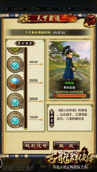 周年庆,送福利。在《古龙群侠传》“天下霸道”玩法中,玩家将正面对决叶孤城、夜帝等豪侠之一,多位在武侠迷中如雷贯耳的盖世豪侠将轮番出场,充分满足玩家挑战极限的愿望,轻松实现巅峰对决梦想。“天下霸道”玩法将根据玩家对豪侠造成的伤害结算神魂等奖励,玩家对豪侠造成的伤害越高,获得的奖励就越丰厚。战斗中,随着血量的减少豪侠的战斗力也会越来越强,不断激发玩家的战斗潜力。