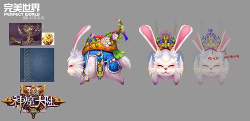 接下来为大家呈现的是近期受到热捧的爆款坐骑——神魔复活节兔子。西方童话中的兔子总是给人一种狡猾精明的形象,例如《爱丽丝梦游仙境》中的兔子先生。原画师们经过多番讨论,决定反其道而行之,将复活节兔子刻画成一只憨厚可爱的形象,嘴边的胡须与身体的毛发纤毫毕现,背上的胡萝卜背包和身侧的金兔子挂坠呈现出丰富细节。设计师真正把握住了玩家的心理,将兔子设计为站立姿态,仿佛家宠兔喂食时的样子,憨态可掬,打中玩家心理。