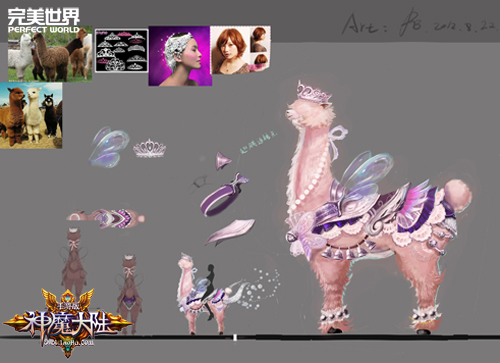 《神魔大陆》手游中的女性人气宠物阿(cao)美(ni ma)一上线就被玩家大肆哄抢,足见其受热爱程度。现实生活中的羊驼本身就是“可爱”、“萌”这一类词的代表,而在手游中,画师们则希望它能在原本人们固定的印象喜感之上,变成一只俏皮的萌物。在多次讨论后,蕾丝、透明翅膀、皇冠、项圈、响铃等,恰到好处的将原本充满喜感的羊驼转变成了女生眼中的抢手萌宠。