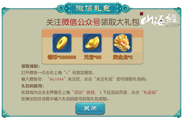 《山海经之赤影传说》手游豪情首发,更为玩家准备了惊喜福利,豪情大奖爽翻天,让你领奖到手软。即日起,玩家关注手游官方微信公众号“shij1044”,点击“关注礼包”领取礼包码,在游戏中换取礼包奖励,内含黄金龙、元宝和铜币,让你瞬间变身土豪。