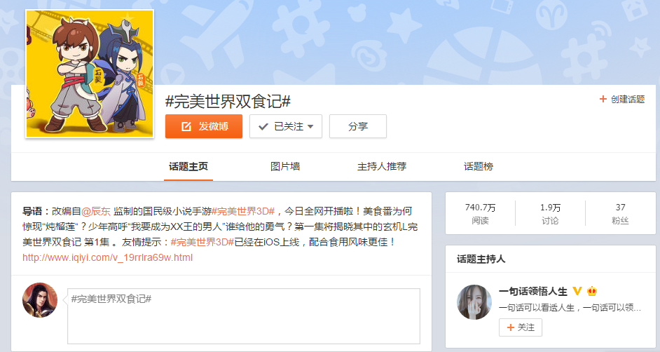 4月17日,《完美世界双食记》第一集正式开播,当日播放量便达到130万次,微博话题阅读量740余万次,一举登顶微博热门话题。该动画以《完美世界3D》手游为蓝本,一改小说原着中的严肃氛围,以轻松诙谐神梗穿插的方式,述了男主角石昊在仙侠世界中为了成为“厨之王的男人”与伙伴们努力奋斗的爆笑日常故事。