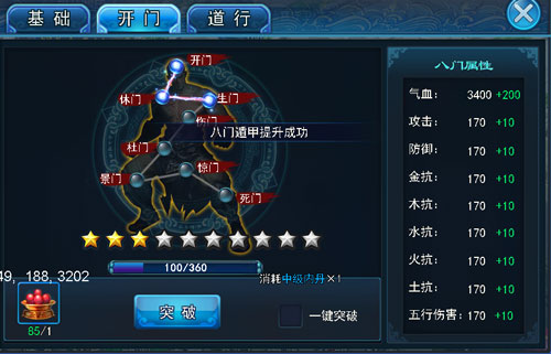 在八门系统可以使用内丹进行八门突破,增加角色属性值。内丹的来源主要是伏魔诛仙副本。当八门系统进阶突破十星之后,玩家可以使用道行精华再次进行突破。道行精华的来源同样是诛仙伏魔副本。道行突破有概率会失败,失败之后八门级别会有所下降。但如果使用了保护符道具则可以直接成功突破。