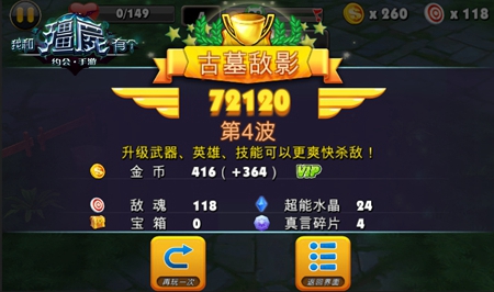 在进入战场之后,会有下一波怪物的提示,告诉玩家关卡情况和积分。难度会逐步增加,小伙伴们要及时升级武器、英雄、技能,才可以更爽快的击杀僵尸拿到更多奖励!战斗结束之后,有联网的小伙伴将会自动上传积分,并且显示挑战奖励和积分。