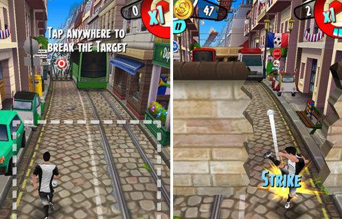 游戏的基本操作与通常的跑酷游戏相同,通过四个方向的滑屏就能够轻松的控制角色的左右移动、上跳和滑行。并且通过一段时间的测试,小编发现操作的手感相当不错,并且与屏幕中角色的互通良好,基本上不存在延迟。当然,除了这些操作之外,游戏最令人感到惊喜的便是“足球”这一元素的运用。在跑酷过程当中,玩家偶尔会遇到被靶心挡住而无法通过的区域,而这个时候,只需要点击屏幕的下半区域,就能用大脚将足球踢出击碎靶心,从而保证整个跑酷的流畅性。