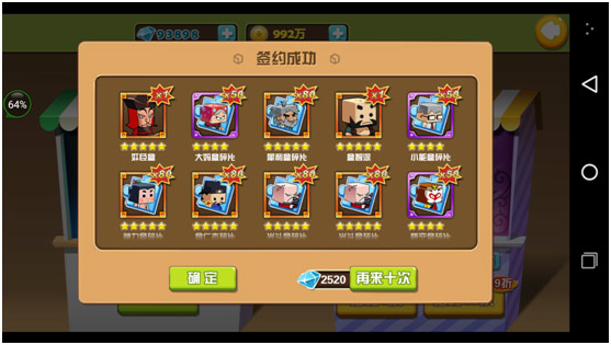 既然是卡牌游戏,英雄自然是核心了,和市面上大部分卡牌游戏类似,英雄主要以颜色和星级来区别,随便来个10连抽(叫签约)就这么多橙卡,第一感觉还是挺不错的。橙卡我所欲也,高星亦我所欲也,二者不可得兼?那就是非洲人也。只不过这个游戏中3星根本不够看,6星才是主力,抽卡是检验人品的唯一标准。