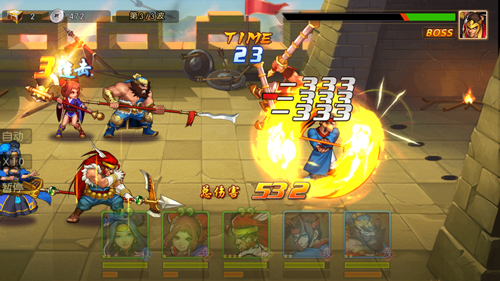 战斗中,武将与街机中一样有个怒气条,攻击或者被攻击都会产生怒气,怒气满了就可以施放必杀技大招,方式很简单,只要点中武将头像向上滑就可以了。手游中武将集气的速度比街机中快得多,一般每局战斗都能用上一两次。