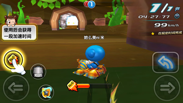 在画面当中玩家点击方向键即可控制赛车进行转向,而左方向键上方则是道具键,当玩家获取道具之后直接点击即可使用,而在右侧则是漂移键,不过在游戏当中只有在遇到转弯时,屏幕上会出现相应的操作提示之后,漂移键才可以被使用,而且只需要点击漂移键就可以自动漂移,而无需配合方向键,这样一来还是比较方便的。