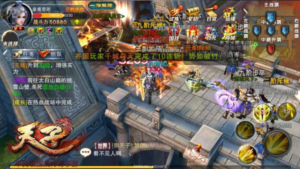 国战一直以来都是《天子》手游的核心玩法,更是玩家展现自身能力的大舞台。周五开启的国战也让备战期充满火药味,想方设法的让敌对国处于劣势,就像开测以来的第一次国战,从实力上楚国是更胜一筹的,但齐国从周五的下午开始,就不断的在边境截杀楚国玩家,设置闯入楚国皇城来达到动摇军心的目的,两国的恩怨情仇被玩家们刻画的非常深刻,让国战从一开始就备受期待。再到正式打响国战时,两个国家都是倾巢出动,经典DOTA式的三路地图,让战局更具策略性 ,真实的物理碰撞,避免了玩家在人群中找不到自己乱放技能的缺点,三十分钟的国战只能用热血疯狂来形容了,团队的配合,战术的使用,完全不同与以往那些拼人头拼战力游戏,造就了一个国战新时代。
