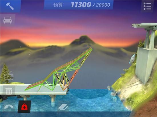 接下来才是教你如何搭桥,如果你玩过类似游戏的话,那么应该明白三角结构是最牢固的,而这个道理在这款游戏中也得到了沿用。同样,造桥是需要材料和资金消耗的,不过本作在这方面进行了精简,材料只有木头一种,混凝土、钢结构、绳索什么的都不再出现,每一关玩家可以消耗的材料数额有限,而我们搭桥的目的就是让小卡车顺利到达终点。