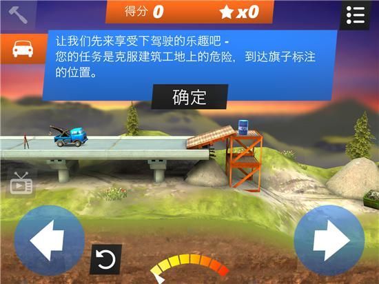 游戏首先向我们展示了如何操控小卡车,与其他的横版特技竞速类游戏一样,按住下方的左右按键来实现前进和后退,如果是在空中的话,则是变为前空翻和后空翻,相比该系列原本让NPC驾车通过的方式要更有操作感,并且过桥的快慢可以由自己掌握。