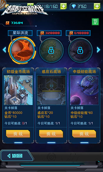 无尽征战模式最接近传统的飞机游戏,躲避子弹不断前进,最后比拼存活时间/里程/积分;竞技场战斗方式是1V1和其它玩家进行PK,这是玩家战队实力最好的体现;星际远征则类似于卡牌游戏中的爬塔模式,每5个小关卡为一层,通过一层能获得额外奖励。