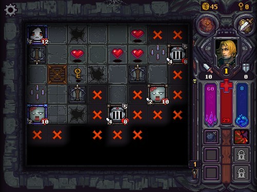 像素和地牢都是小编比较喜爱的游戏元素,探索未知的区域永远充满着刺激。该作采用的正是这种揭开迷雾的爬格子方式,当然爬格子不能算是一个很新的设定,放眼《地牢爬行》、《地下城堡》、《森林之神》,甚至一些国内网游里的副本小游戏都采取了这种扫雷式的设定。
