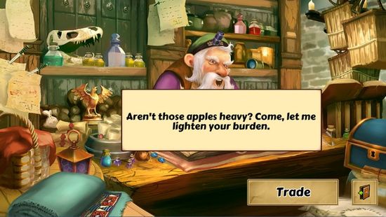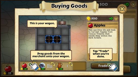当玩家到达目的地时,只需在商店中将要销售的商品放入屏幕下方的物品栏即可,只需要轻松的拖拽就可以完成交易,所以这款游戏更多的是需要脑力的。至于沿途作战方面,就显得有些不足,首先玩家需要装备武器和技能,在路途中一旦碰到怪物,选择攻击方式,对着怪物一阵狂点就可以了,不过因为小编是用手机测试的,而在手机的屏幕上,怪物显得特别的小,点击起来有一定的困难,所以操作上有些不顺手,关于这一点,可能在iPad上会比较好吧。