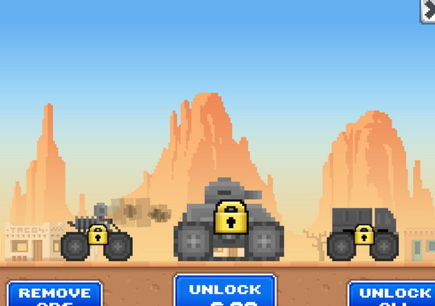 疯狂的卡车的画面采用2D横版屏幕进行展现,而BoomBit的游戏通常都是使用竖版屏幕的,所以本作可以看作是B社做出的一大改变。游戏采用了时下很流行的像素风格,看起来非常的复古,而且游戏中还有多种车辆的造型可以让玩家选择,不过在像素画面下这些小车看起来都差不太多,当然除了那辆坦克。